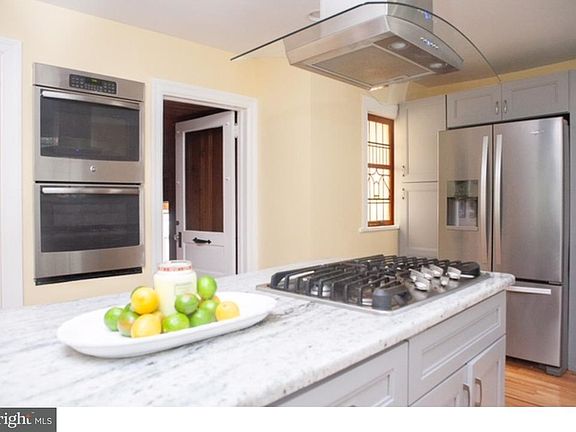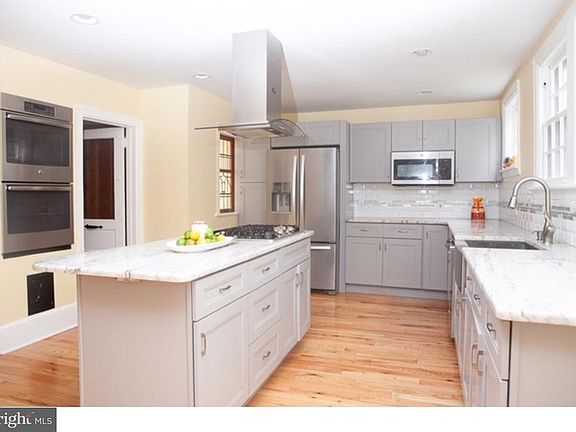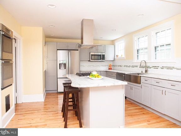 Drastic Reduction in Price. This Classic center-hall colonial has original mill work but has recently been updated with a model kitchen with center island with two in wall ovens. The spacious living room with hardwood floors, wood fireplace and French doors, is also a great space for entertaining and leads to the Cozy Sun/Family Room with an adjacent newly-renovated full bath. Brand new open kitchen with a ton of natural light is the focus of the lower-level, with all new high-end kitchen appliances along with new lighting. Full size eat in kitchen with lots of cabinets and good counter space complete the lower level of the home. House has plenty of room for entertaining. Ample parking is provided by the 2-car garage. From the driveway enter an enclosed breezeway that connects to the garages, basement, and open new kitchen. One of the two garages was converted into a hot tub room by the original owner; but now serves as a storage room. There is an unfinished basement with laundry facility and room for a power room. Ample space to create a workroom or even a craft room. Master bedroom features his and her closets and a storage bench window seat. Hall bath with subway tile has stained glass window. Two additional bedrooms on 2nd level, one with built in bookcases and a window storage seat. Third floor has 2 additional bedrooms with plenty of natural light, which can be used as yoga studio or study area. Don't feel like cooking dinner? Walk two blocks to Keswick Village where a variety of restaurants and shopping await you. Wondering what to do for entertainment? The Keswick Theater is your answer with a world-famous line up of comedians, singers and musicians on a weekly basis just 4 blocks away and no need to worry about parking. Park, ball fields and the train are all nearby. House comes with a Home Warranty and a $1000 credit to fence in private yard area.
