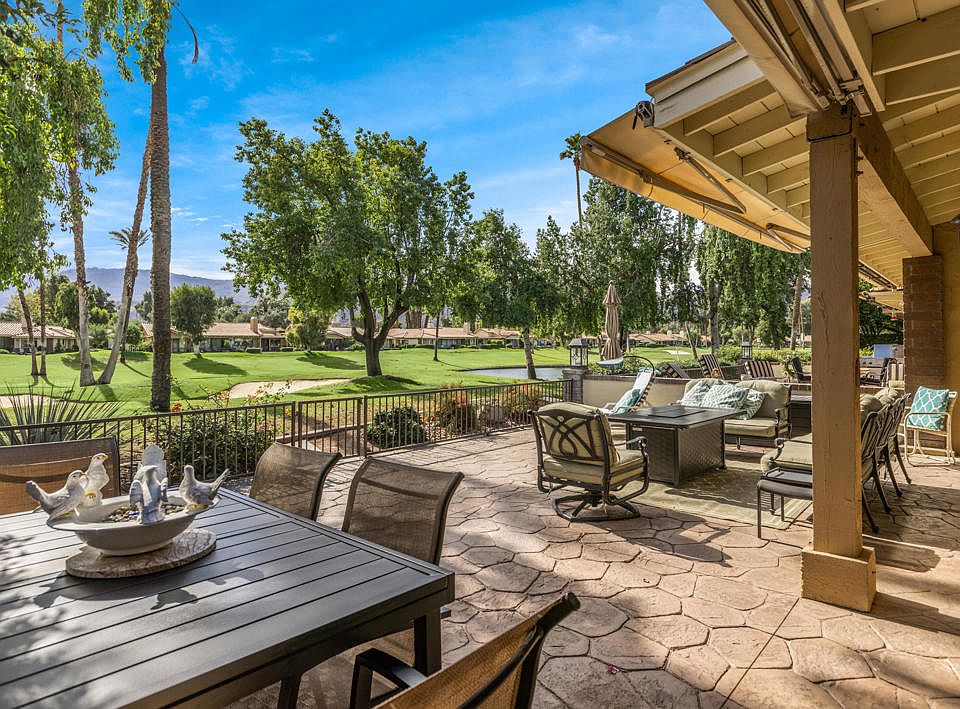 Enjoy the panoramic southern mountain, golf course and lake views from the expanded back patio of this sought-after 300 Plan. The site of this home can easily be described as one of the best in the Club with it's interior, cul-de-sac, location and steps away from a lovely community pool. Home has been updated and features a converted atrium (now a dining room) tile flooring, stainless appliances, updated baths and 1800 square feet with 3 bedrooms and 2 baths. From the beautifully landscaped front courtyard out to the expanded enclosed patio, and awnings, this home offers it all.