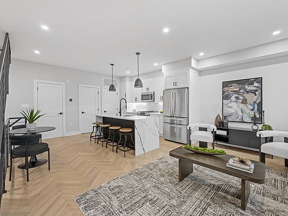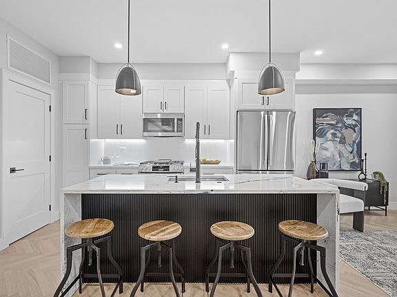 PH3 is a 2 Bed/1.5 Bath with 1090+/- sq ft. Open Kitchen/Living/Dining on main level. Kitchen has large Quartz Island, stainless appliances + shaker cabinetry. Primary Bedroom comes complete with large closet and additional bonus space. Additional large guest bedroom. Bathroom with tiled shower, frameless glass shower enclosure. Herringbone hardwood throughout. Recessed lighting, Central AC, in unit laundry, large deeded storage unit and private 200 sq ft roof deck with views! 169 Maverick is ideally located next to multiple East Boston parks, restaurants and is ONE BLOCK from Maverick T Station, 5 minutes from major highways + Logan Airport.