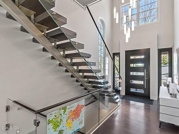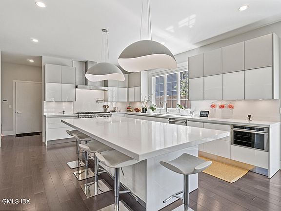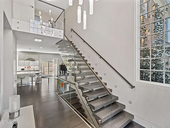 Spectacular 2017 custom construction in downtown Greenwich. Contemporary high end finishes throughout with generous ceiling height on all 3 floors totaling 6000ft + of finished space. Large open plan kitchen / fam room leading to a beautifully designed covered porch at the front with retractable screening and paved sideyard area. Temp controlled wine wall, large office, dining room and pantry off the mudroom area. Floating staircase leads to generous primary suite with 2 WIC and light filled bathroom. 3 further ensuite bedrooms and laundry on the second floor. Finished lower level includes 5th bed / bath, gym, movie room / rec room all finished to a very high standard. Elevator shaft is incorporated in to the design for a future owner if desired. 2 car garage.