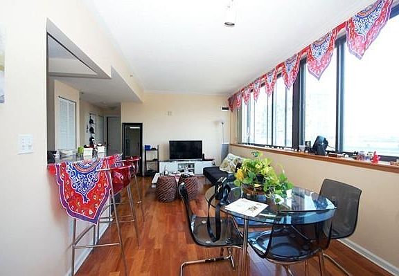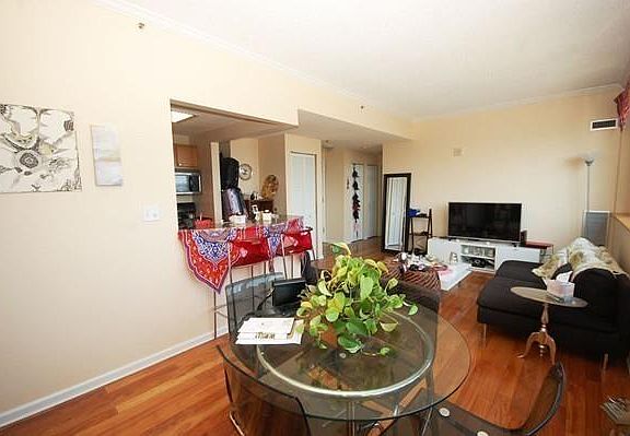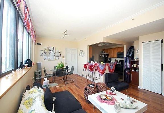 Sunny high rise condo in the Glass Factory building. Great layout, large open space in living room with brilliant hardwood floors, large tall windows with open panoramic view from 7th floor, modern kitchen with built-in breakfast bar, granite counters, high ceiling, double closet in living room, in-unit laundry, walk-in closet & master bathroom in master bedroom, spacious full size closet in 2nd bedroom, spacious 2nd bathroom. Amenities: Lobby with concierge, management office, two elevators, fitness center, media room, business room, common laundry room, garage parking space #2 included ($20.67 per month for garage fee).