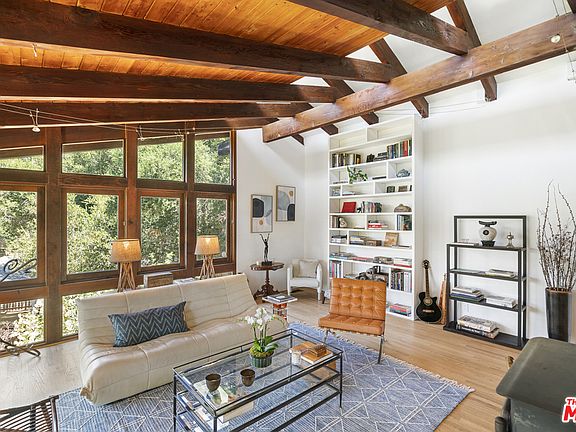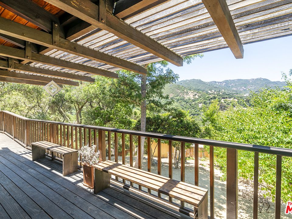 Remarkable Stunning wood & glass home with striking cross canyon of Topanga state park and the famous Powder-horse ranch. This brilliantly crafted home has generous wood beam each accentuated with Iron that surround wall to ceiling glass windows, highlighting the spacious living room. High ceilings throughout lend incredible space to the entire home. This is a master piece to hang masterpieces. Home was created to take advantage of the beauty of the canyon, with a pelt iron fireplace, that supplies warmth and romance. hand crafted doors open out to large decks were you can take advantage of the afternoon sun & cool evening breezes. Extensive master bedroom suite has a pvt entrance and deck. The artistic 2nd bedroom opens up to large covered tranquil deck, while the large third bedroom could be a perfect workout space. Separate Guest quarters and tons of Land to relax or hike on, large storage sheds add extra space, Location is just seconds from Topanga State park.