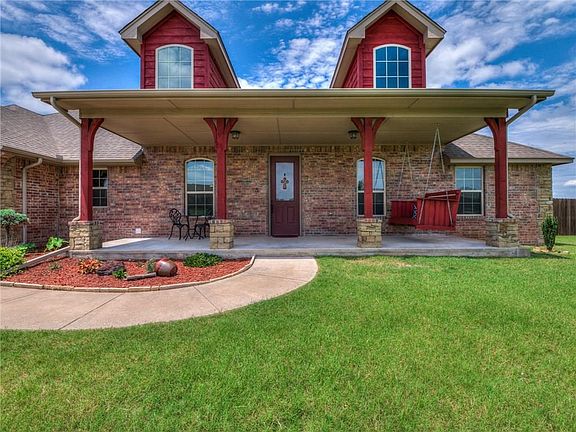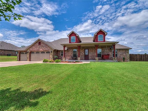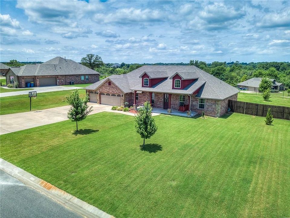 Feels like country living on this large, approximately 1 acre corner lot in Choctaw! This one-owner home offers a great floor plan with the living room, kitchen, and breakfast nook at the heart of the home. The master suite is on one side of the home with a bump out for additional room, a huge two-tiered walk-in closet, jetted tub, double sinks, and an upgraded brick shower floor. The other 3 bedrooms are on the other side of the home with 1-1/2 bathrooms. With the flip of a switch enjoy the corner fireplace. Other home upgrades include the wood flooring in the living room and the extra wide driveway. Enjoy the sunrises and sunsets from your large covered patios, and the ponds in this small and conveniently located neighborhood. Stone Briar - a community to call home!