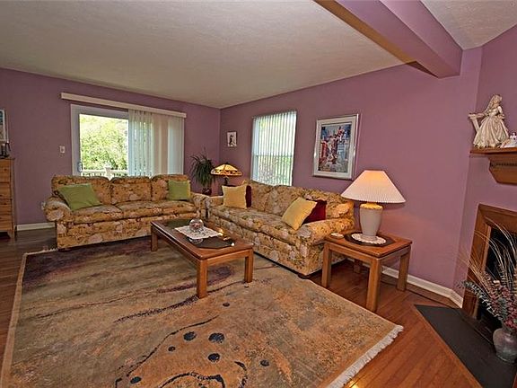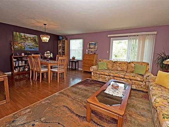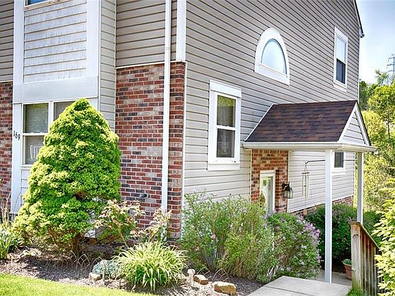 Stylish end unit townhouse! Gleaming hardwood flooring runs throughout the living and dining rooms, kitchen, and both bedrooms. The living room offers a cozy corner gas fireplace and slider to newer rear maintenance fee deck with fabulous wooded views. Open to the dining room for ease in entertaining. Kitchen provides stainless steel refrigerator, dual sinks, ceramic tile backsplash, peninsula breakfast bar seating plus dining area. Dramatic vaulted ceiling and double closets in both spacious bedrooms. Den=wonderful loft in master suite with wood railing. Two car garage is a bonus.