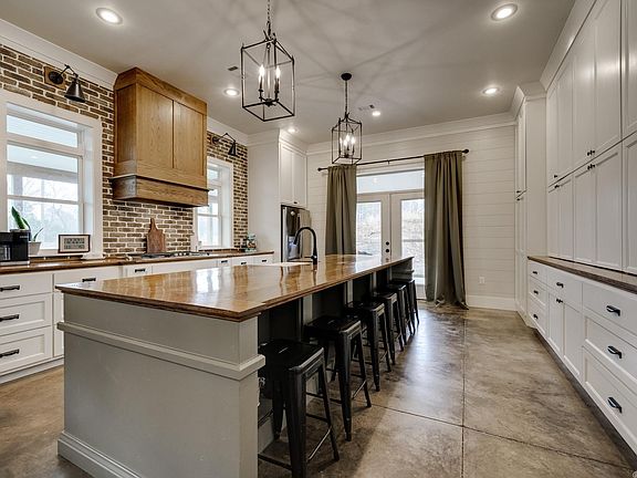 Beautiful home on 5 acres with large, covered wraparound porch. Lots of living space, spacious living/dining/kitchen area with gorgeous custom cabinets and built ins. Nice open space with vaulted ceilings.