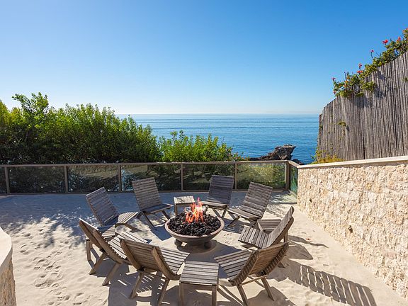 One of only a few front-row homes in the coveted community Shore Cliffs with private stairs to the sand. This ocean-front sanctuary is a true architectural splendor designed as a celebration of art, nature, and the senses. Characterized by bespoke finishes and globally-sourced materials throughout, the approximately 8,060 square foot estate invites relaxation with its wood coffered ceilings, fireplace sourced from Spain, stone flooring, brick accent walls, and dramatic sliding glass doors framing a picture-perfect vista of the ocean. Designed in harmony with the sea, grandly appointed living and recreation areas seamlessly flow between one another making entertaining a breeze. Open to the great room, the elegant gourmet kitchen is outfitted in stone countertops, custom millwork, and Wolf appliances. Upstairs, the generously-sized master retreat is a den of sophisticated glamour complete with a boutique-like dressing room, and walls of glass doors that lead to a private balcony capturing blue-water views extending to Catalina Island. Rivaling the finest resorts, the grand master bathroom impresses with dual vanity sinks, a soaking tub, and an oversized black marble walk-in shower with dual shower heads. Outside, the rambling park-like grounds comprise of a pool, spa, a private bath, barbeque, multiple al fresco dining areas, secluded lounging beds, a sand area, and direct access to the private beach below. Adding to the allure of the residence is a state-of-the-art home cinema with a 110-inch screen, wet and dry saunas, an extensive home automation system, and exquisite Italian roof tiles. Near world-class dining, shopping, and entertainment, an unmatched Corona del Mar lifestyle of seaside leisure and luxury awaits. Pets must be submitted/approved.