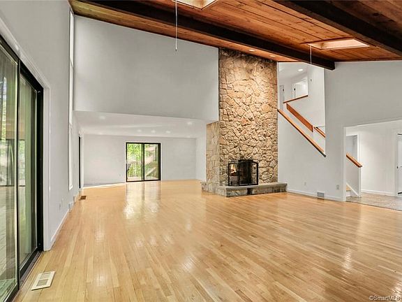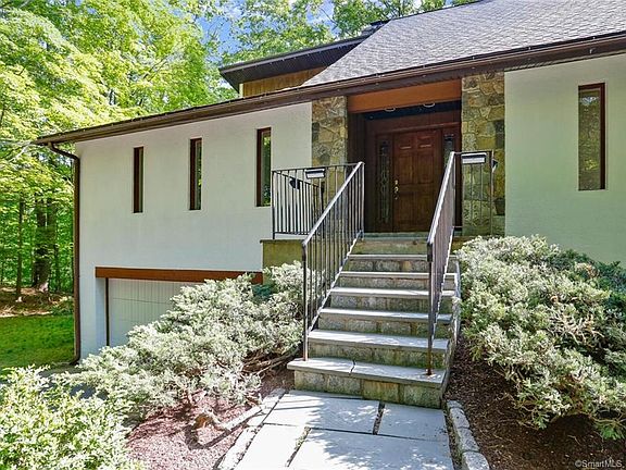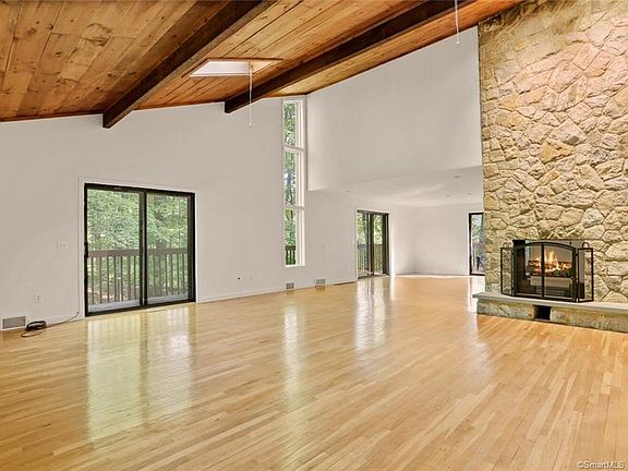 Enjoy the tranquility of Easton in this timeless contemporary with in-ground pool on 4 acres of natural purity. The home is anchored around a floor to ceiling stone fireplace, surrounded by vaulted ceilings, skylights and sliding doors. This property features 4 bedrooms, 3.5 bathrooms with 3,570 finished square feet. Step out the back door to onto the wrap around deck overlooking woodlands. The dining room leads to the kitchen with marble floors, stainless steel appliances and spacious dining area. The first floor is also complete with a bedroom/den and a marble bathroom. Walk up the open staircase and through a hall of closets leading to the Master Suite with skylight, soaring ceiling, and whirlpool tub. Two additional bedrooms and another full bathroom complete this floor. The walk-out lower level is partially finished with a recreational room, brick fireplace, half bath/laundry, workshop and French doors leading to a private patio. Your backyard retreat is complete with an in-ground pool (new liner) and rustic pool shed/deck (as-is). New Roof 2021. Top rated schools.
