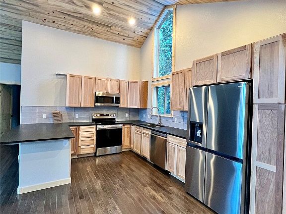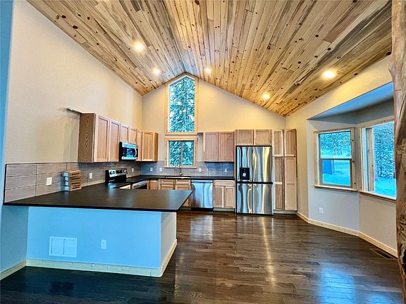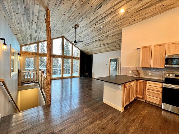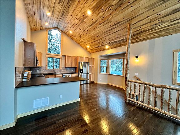 New construction opportunity with modern elegance and classic design. Featuring 8" TruWood siding in charcoal and natural wood trim for the exterior and a galvalume metal roof, this stunning home showcases meticulous attention to detail. Step inside to an inviting interior blending contemporary style with timeless charm. The kitchen boasts shaker-style cabinets, sleek leathered black granite countertops, with a peninsula to add to the abundant counter space. Wood floors in the main living area and plush carpeting in the bedrooms and downstairs family room offer comfort and warmth. The passive solar heating system and strategically placed large windows create an energy-efficient and bright living space paired with the beetle-kill T&G ceilings and log accents. Upstairs features a double vanity with en-suite access from one of the two main level bedrooms. The walk-out basement allows for customization and seamless indoor-outdoor living. With three bedrooms plus a bonus room/office, a cast iron gas stove, a spacious deck, and two living areas, this home offers the perfect blend of aesthetics, functionality, and comfort. Don't miss the opportunity to make it your dream home. Estimated completion Summer 2023.