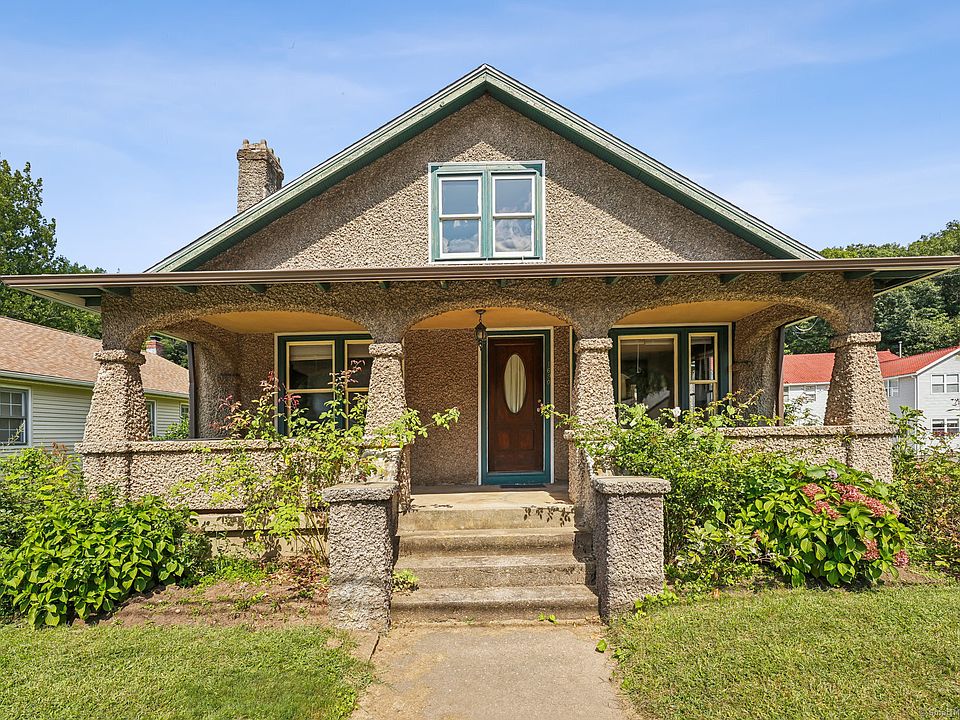 Charming and full of character, this older home is simply adorable and perfect for someone looking to add their personal touch. The exterior features unique masonry veneer, offering a classic look. Inside, the kitchen includes a pantry space, storage, and meal prep area, with a very efficient layout. A full bath is conveniently located off the kitchen, featuring wide doorways and ample space. The first floor boasts a large bedroom with hardwood floors and an expansive L-shaped living and dining area, anchored by a stunning stone fireplace and original hardwood throughout. You'll love the intricate, original woodworking that adds timeless charm to the home. Upstairs, there are two additional bedrooms, a full bath with a tub, and a small room that's ideal for an office or flex space. The roof is just five years old with new gutters added at the same time. Other highlights include 200-amp electrical service, central vacuum, oil heat, and a huge basement with a concrete floor. Outside, you'll find a detached two-car garage with an attached shed area, perfect as a cozy sitting space, plus beautiful perennial flowers surrounding the property. The property even extends beyond the garage, offering extra space and privacy. One of the home's best features is the welcoming front porch-perfect for enjoying morning coffee or relaxing in the evening. Schedule today!