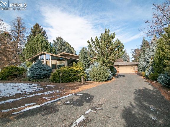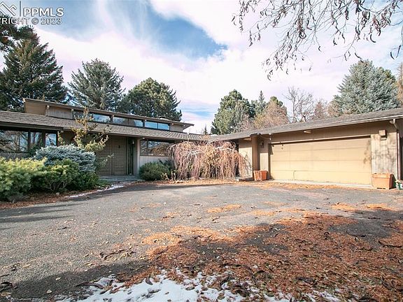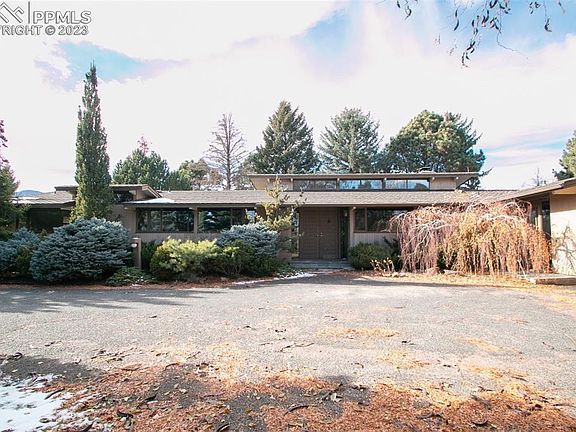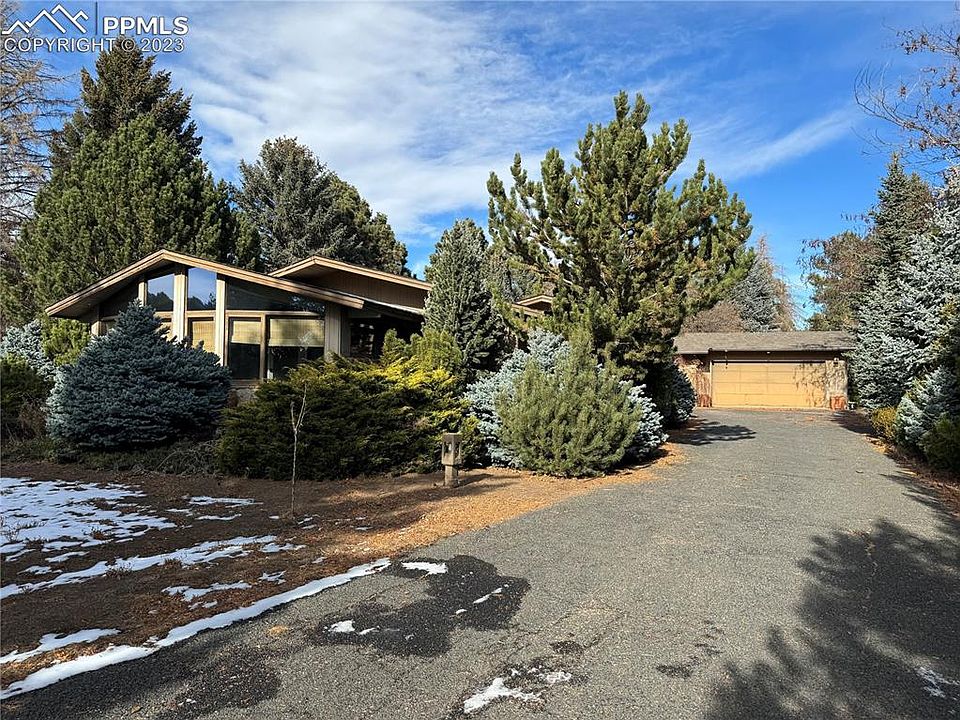 Discover the charm of this custom mid-century modern home in the heart of sought-after Kissing Camel's Estates. With nearly 2700 sq/ft on the main level, designed for entertaining, it features vaulted ceilings, exposed beams, beautiful woodwork, and original hardwood floors. Enter through double doors into a welcoming foyer, featuring a cozy den adorned with a wall of built-in bookshelves. The living room is impressively large, highlighted by soaring vaulted ceilings, built-in bookshelves, and a warm gas fireplace. Flowing into the expansive kitchen, you'll find a sizable island with a gas cooktop, perfect for culinary adventures, which seamlessly opens to a spacious dining room, complete with its own fireplace. The primary bedroom is generously sized, boasting an attached bathroom with a beautifully tiled walk-in shower, partially finished but with great potential. This bedroom also offers private access to the front brick sunroom - perfect for all your plants. Bedrooms 2 and 3 conveniently share a bathroom. Additional storage space is available in the partial basement. The full wall of sliding doors off the kitchen opens to a 2/3 acre of mature landscaping on Kissing Camel's South #8, offering an unbeatable view. This unique home, in the midst of an unfinished remodel, is part of a community with 24-hour guarded entry and stunning views of Pikes Peak and the Garden of the Gods. Membership opportunities are available at the Garden of the Gods Club and Kissing Camels Golf Club, close to endless hiking trails in the Garden of the Gods Park. The Kissing Camels Club itself boasts a 27-Hole championship golf course, a full-service pro shop, golf lessons, and a practice facility, alongside casual dining and a 21,000 sq. ft. golf clubhouse. This home is a rare find, offering both a glimpse of history and a canvas for future dreams.
