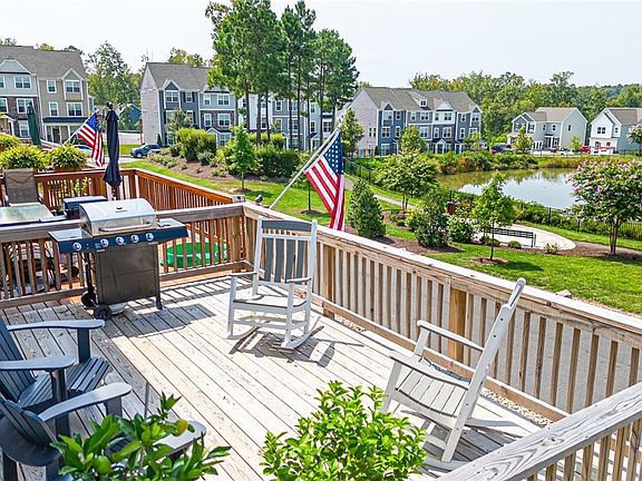 Welcome to Foxcreek & this absolutely stunning Eastwood Built Townhome with a garage that is only 2 years old. This stunning WATERFRONT end unit is the Moseley plan and surely one you do not wanna miss out on. If you blink it will be gone! Boasting over 1800sqft along with 3-bedrooms, 2 full baths & 2 half-baths, you won't find anything you dislike. This unit is loaded with tons of upgraded selections throughout. Ground floor offers a bright office w/French doors, large windows, closet, and a half bath. Second floor has a lovely open floor plan featuring the kitchen w/ stainless steel appliances, gas stove, pantry, center island w/breakfast bar, quartz counters, recessed lighting, and a farmhouse sink. Dining area shows off large windows, detailed moldings, chandelier, and a storage closet. Family room also on this floor with recessed lighting, tons of windows, recessed lighting, and access to your rear deck with the INCREDIBLE VIEWS. The third floor is where all three bedrooms are including primary suite offering crown molding, walk in closet, ceiling fan, & ensuite bath w/walk in tiled shower w/transom windows, dual sink vanity, and tiled floors. Two other secondary bedrooms w/large closets, overhead lighting, and wall to wall carpeting. Laundry area is also on this floor. Other features include pull down attic for storage, neutral paint throughout, access to pool and neighborhood amenities like clubhouse, splash pad, and athletic fields. O wait and award winning Chesterfield County schools. Come see this one TODAY!