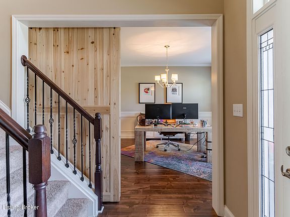 Step inside and be greeted by the grand foyer, leading you to the versatile office space on your right, adorned with charming barn doors for added privacy. Straight ahead, the great room awaits, featuring a stunning stone fireplace and custom-built cabinet and display area, creating an inviting atmosphere for gatherings and relaxation.