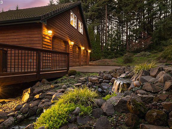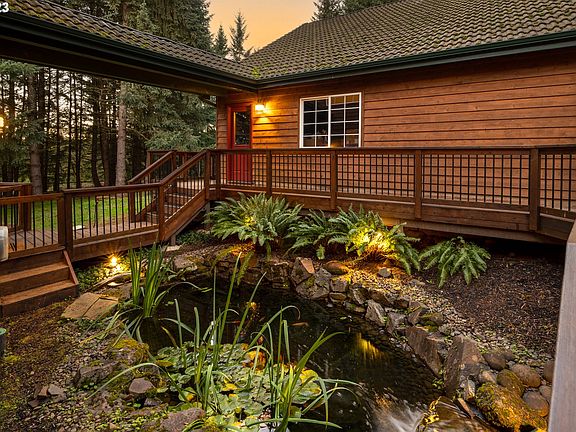 Can you hear that....? Listen to the serene surroundings of a forested Northwest lodge, nestled on 12 acres of wooded meadows within the Sherwood, Newberg, and Wilsonville triangle. Approach this Northwest Lodge-style home via a lengthy paved driveway, embarking on a private journey.Cross the bridge leading to the front door, where you'll be greeted by the soothing sounds of a stream flowing into a fish pond. Complete tranquility welcomes you into this sanctuary, featuring spacious living rooms with open-beam ceilings and large windows that frame the natural beauty of the outdoors.The kitchen is tastefully designed, boasting custom inlays in the floors that harmonize with the cabinetry. The vaulted Primary Suite offers a cozy fireplace, a tub, a walk-in closet, and a shower. Upstairs, you'll find three additional bedrooms, with another one on the main floor and a den/office. The main hallway bathroom is equipped with a heated tile floor and a walk-in glass shower, providing versatility for multi-generational living.Relish peaceful views from the back deck, overlooking the lush forest and the untouched natural landscape. Above the three-car garage, there is an accessory dwelling unit (ADU) that enhances the potential for multi-generational living, guest accommodations, or a home office.