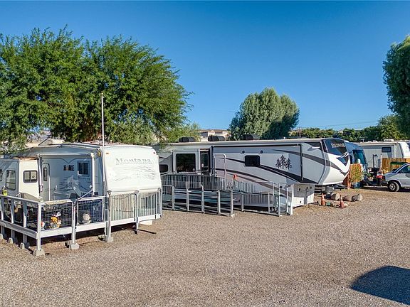 36 1/2 foot fifth-wheel tiny home for sale. This home is situated on a shaded lot in the San Gennaro Riverfront RV Park on the Colorado River in Bullhead City, Arizona. Amenities include access to the Colorado River by a private boat launch, beach, and dock. Views from the 8x20 deck give glimpses of the Spirit Mountain Wilderness and the Colorado River. The cozy, shaded back patio garden features a waterfall, a fire bowl, and a misting system. An 8x8 shed houses a washer, a dryer, and ample storage. Parking for two vehicles is provided in front of the home. The living area is surprisingly roomy due to the dual, opposing sliders. Laminate flooring has been installed throughout the home. Three recliners, a four-seat dinette, a built-in desk, and a free-standing china cabinet provide suitable accommodation. A residential mini-split heating and air conditioning system provides year-round comfort at a reasonable cost. The compact kitchen has a three-burner propane gas range and oven with an overhead microwave. A residential apartment-size refrigerator has 10 cubic feet of capacity. A hard-lined water filtration system treats the entire home. The bedroom/bathroom area has a respectable-sized shower, a small vanity, a large linen closet, and a residential flush toilet with a hard-lined sewer connection. The bed has a queen-size memory foam mattress on an adjustable frame with massage. A large hanging closet and built-in dresser with overhead cabinets give ample clothing storage. This tiny home has other unique owner-installed features that must be seen to be appreciated. Lot rent is currently $475/month, and the owner is responsible for paying propane and electricity. The electric bill has been under $50 during the cooler months and between $50 and $100 during the summer heat. After four years of comfortable living, the owners find it necessary to relocate. With the very reasonable asking price, this home is not likely to be on the market for long. Please call your agent for an appointment for a viewing.