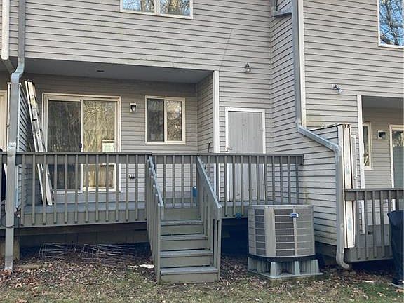 Newer central air conditioning system (2017) in this beautiful townhouse with an open floor plan. 2 bedrooms with vaulted ceilings and oversized windows, 1.5 baths. Lovely hardwood floors on the main level. Updated fully applianced kitchen with a new dishwasher and a breakfast bar open to the dining area and living room. Sliders to the back deck with a storage unit overlooking the backyard and woods. Full basement with plenty of storage space, a washer and dryer, just waiting to be finished. Freshly painted walls. Assigned parking. $1200 carpeting allowance credited to Buyer upon closing. Such a quaint, well maintained complex that sets back off the road. Move in condition.