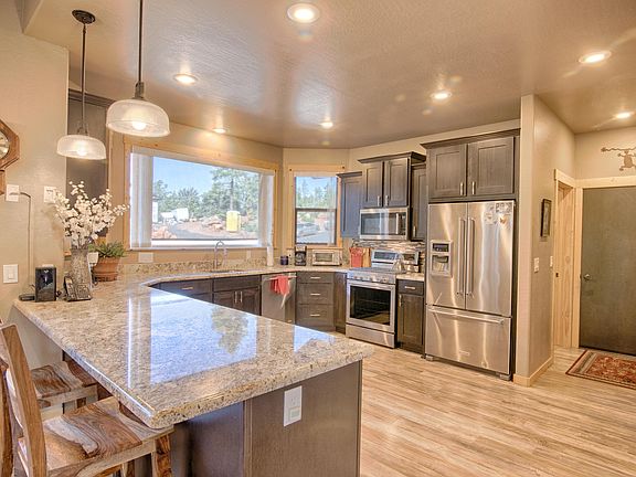 Beautiful 3BR/2BA, 1962 sq ft home in Snow Creek has an open floor plan, custom cabinets, granite counter tops, engineered wood flooring, covered deck, natural gas fireplace, A/C, paver driveway, maintenance free siding and a metal roof. Huge covered deck with T&G wood ceilings extends the living room for great outdoor living. The oversized double garage has an epoxied floor & cabinets. It is extended with a separate entrance which provides extra space for a workshop, toys, or your oversized truck.. The attention to detail continues on the outside with gutters & downspouts, fenced pet enclosure and landscaping even a shed for extra storage.