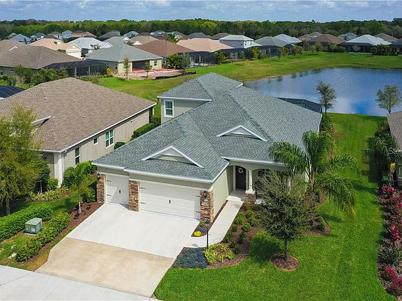 Take a breath of fresh air in welcoming Rivers Reach - this outstanding four bedroom home is the perfect place for your growing family or the work at home/school at home set up! Beautiful curb appeal with it's stacked stone columns and inviting front porch, this home is warm and spacious. With the homes wide foyer entry and expansive rooms, you'll never feel cramped with the multiple living areas including a formal living and dining room set up, spacious kitchen and great room area, separate den/office downstairs, along with three bedrooms and an over sized bonus room upstairs with adjacent guest bedroom. The kitchen offers timeless white Shaker style cabinets, with many pull out drawers for ease, a large center isle, slate colored GE appliances and a terrific walk in pantry. The great room with it's tray ceiling overlooks the outdoor living area. Master bedroom is over sized and offers two outstanding closets with custom shelving, a double sink vanity and walk in shower. Two additional downstairs bedrooms share a full bath and the office/den is located in the rear of the home, near the pool bath. Upstairs is big bonus room, full bed and bath - perfect for guests, teens or even your Mother In Law! Walk through the fully pocketing sliding door to the outside and you'll enjoy just as much space with ample covered sitting area and expanded lanai overlooking the sparkling heated salt water pool and pond. The yard has been professionally landscaped and is just beautiful with it's coordinating flowering plants. Details that give the home a touch of class include the herringbone subway tile back splash in the kitchen, upgraded vinyl flooring in the living areas, master bedroom and office/den, gorgeous plantation shutters throughout and custom closets in each bedroom. Rivers Reach is just a short distance to amenities including the Manatee River, shopping and restaurants and the gated neighborhood offers a community pool, play ground and walking trails.