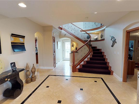 Beach access. Elegant upstairs living with views from every room! Enter home onto Beautiful inlaid Travertine floor, leading to Spectacular cherry wood circular staircase up to main level. Open floor plan w/custom finishes throughout. Koi pond w/water fall, attached garage plus RV parking... You must see this home to appreciate the craftsmanship, views and all it has to offer. Deeded-FEE SIMPLE Property.