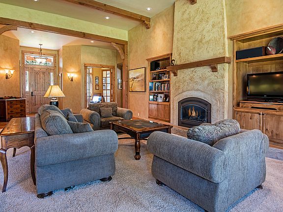 Terrific home and location at Aspen Lakes! Home fronts dedicated open space and backs to gorgeous 18th fairway. High quality single level home features a wonderful floor plan that lives much larger than its 2800 sq ft. Outside enjoy the covered pavered patio overlooking a beautiful setting with views of towering pines and lush grass, 3 car garage with ample paved parking, and portico viewing porch. Inside experience the great room, huge gas fireplace , GE Monogram kitchen appliances, distressed hickory flooring, concrete counters, tile accents, built in hutch, wine storage center, custom wood beams, knotty alder tall doors, hand troweled plaster walls.
