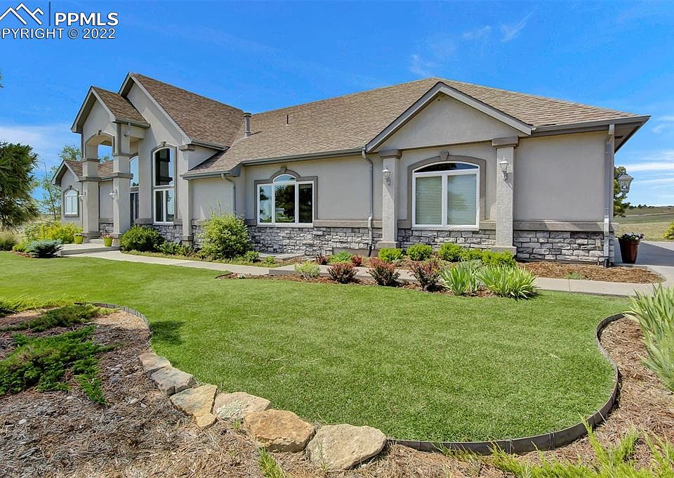 SPECTACULAR FORMER PARADE HOME SITUATED ON 5 ACRES WITH INCREDIBLE PIKES PEAK VIEW! Located on a cul de sac with paved driveway and 360-degree views! Sprawling ranch-style home offers custom features throughout! A dramatic 20-foot-high entry wows you as you enter the home. Vaulted living room with beautiful stacked-stone fireplace, built ins and walk-out access to the covered and partially-enclosed deck where you can enjoy the amazing mountain views! Gourmet kitchen updated in 2017 offers double islands, granite countertops, walk-in pantry, soft-close drawers, tile backsplash, gas range, wall microwave, wall convection oven and breakfast nook. Nearby formal dining room has a gorgeous barrel ceiling you'll love! Main-level luxurious master suite featuring walk-out access to deck, enormous walk-in closet, adj. 5-pc bath w/jetted tub, double vanity, shower with built-in seat plus a bidet in commode room. Junior master suite at opposite end of the home with adj. 3/4 bath offering handicap accessibility (zero threshold shower, double vanity is open under one sink, wide doorways). Additionally on main level is a half bath with stone-accent wall, elevator, laundry/mud room which includes front-loading washer/dryer, utility sink and ample cabinetry. Easy, same-level access to oversized finished 4-car garage. Take either the elevator OR the stairs down to the finished walk-out basement with two family rooms separated by a see-through gas fireplace, fantastic wet bar, 3 add'l bedrooms with walk-in closets, shared bathroom between bedrooms 3 & 4, another 3/4 bathroom AND a 5th bedroom with French doors would also make a great theater room. HUGE covered patio is just off family room. Other features include: BRAND NEW UPGRADED IMPACT-RESISTANT ROOF, hardwood flooring, coffered ceilings, 2 furnaces, 2 humidifiers, 2 water heaters, central A/C, water filtration system, radon mitigation, intercom, security system. Peaceful location with easy access to Colorado Springs and Denver.