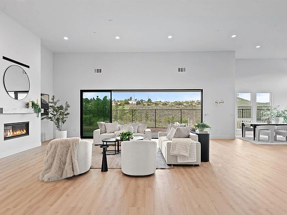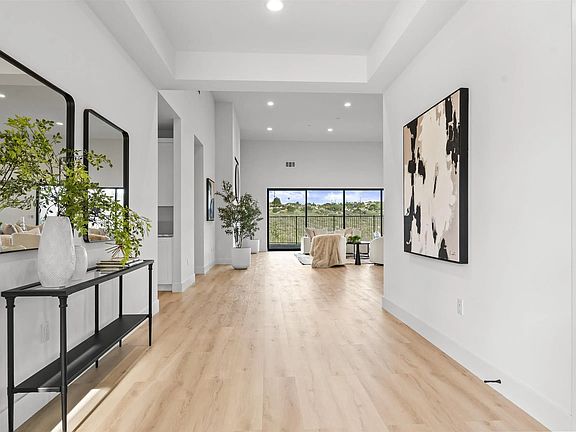 A true stunner, this brand-new, never-lived-in modern home sits on its own private, oversized lot with no neighboring homes, offering exceptional privacy, breathtaking canyon views, and potential to build an ADU. Located in North Poway, near The Heritage and the entrance of Maderas Country Club, the home also provides direct access to nearby hiking trails and serene natural surroundings. This thoughtfully designed residence features 4 bedrooms, 4.5 bathrooms, a dedicated office, and a bonus room, with each bedroom offering its own ensuite bathroom and walk-in closet. Upon entry, you are welcomed into a stunning grand room with soaring 15-foot ceilings and expansive windows that frame the canyon views and flood the home with natural light. The gourmet kitchen is equipped with Thermador appliances, including a 48-inch gas range, hood, wine chiller, microwave, and refrigerator—ideal for both everyday living and entertaining. Recent upgrades include new sleek modern garage doors, new flooring throughout, owned solar, dual-zone HVAC, and an EV charger for modern convenience. As an added value, HOA dues are paid through June 2027. This is a rare opportunity to own a private, luxury new-construction home with views, premium upgrades, and an exceptional location in one of Poway’s most desirable communities.