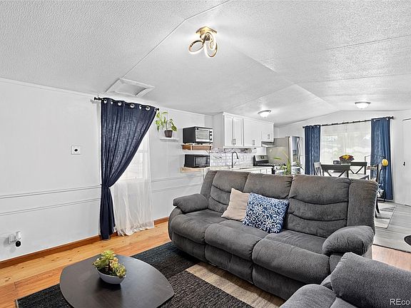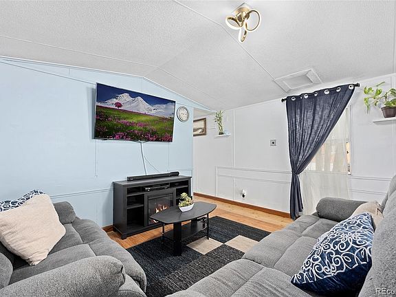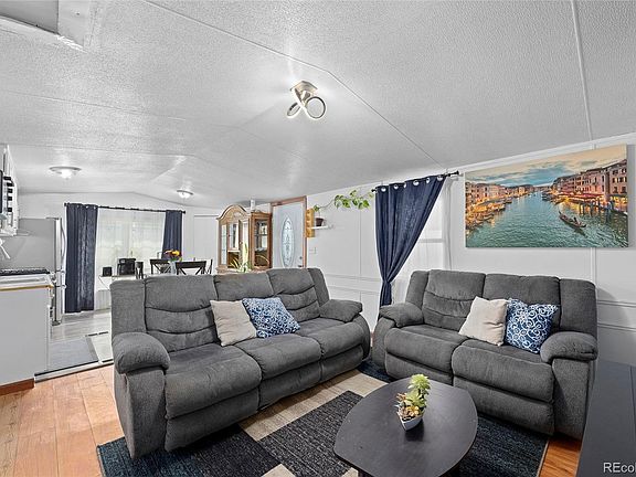 You won’t want to miss this well-maintained two bedroom home with newer furnace, newer paint and three parking spaces. Enjoy the low maintenance living that this home offers with an airy open layout, large windows, and plenty of space. The open-concept kitchen overlooks the living room and features white cabinets with ample storage space, stainless steel appliances, and an eat-in kitchen area. Entertain or relax in the living room or out on the covered, private patio all summer long. You’ll love how spacious the primary bedroom feels and the layout of the secondary bedroom which can also serve as a home office or flex space, full bathroom and a laundry area with shelving. This manufactured home the perfect first home or first investment property. Enjoy the easy access to I-70 and I-225, commute to the Denver International Airport in under 15 minutes, Downtown Denver in under 30 minutes, multiple neighborhood parks in under five minutes and tons of shopping and entertainment options all around. Call for your private showing today!