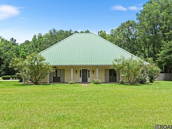 This is the house you have been looking for!! Acadian House with a full front porch, working shutters over the two sets of French doors, on 2 acres, at the end of a one street subdivision and the house backs up to the woods, and it has the 36.5 x 30 workshop that you need, with rollup doors for your boat or tractor! Beautiful real wood floors and crown molding in the Den and Foyer. The The spacious Den opens to the large covered patio with pretty beaded board ceilings, sink, cooktop, mini refrigerator, bar, ceiling fans and its own 1/2 bath and open shower. Large Master Bedroom with boxed ceiling, ceiling fan and access to the rear patio/outdoor kitchen. Master Bath has tiled floors, double vanities, block glass window above the jetted tub, separate shower, tons of storage and a large walk in closet. All Bedrooms have ceiling fans. Each Guest Bedroom has a set of French doors. The Kitchen has a smooth cooktop, pantry, breakfast bar and is open to the breakfast room. Large laundry room with a 1/2 bath, just off of the Breakfast area. 2 Car garage with access to the outdoor kitchen. Completely fenced in fenced yard. The house did NOT flood in 2016 and flood insurance is not required.