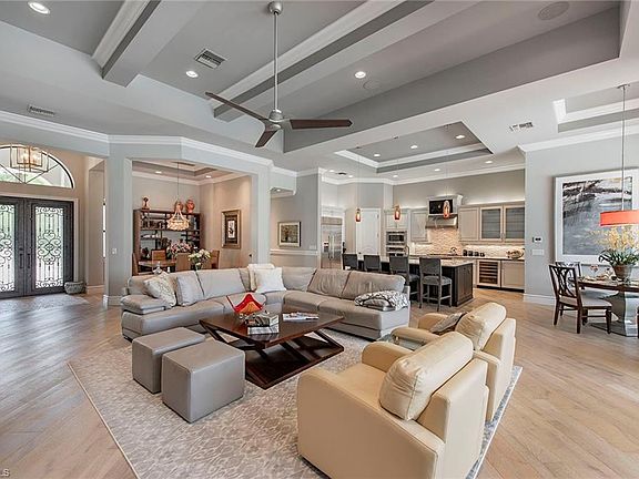 This extravagant home was designed with an open floor plan that flows effortlessly between indoor and outdoor living while presenting panoramic views of the 12th fairway, lake, and nature preserve beyond. Featuring 3-bedrooms, 3-1/2-baths, den, formal dining room, breakfast nook, a beautiful kitchen with quartz and granite countertops, Thermador appliances and hand-scraped wood flooring throughout. Escape into the expansive outdoor living area featuring ample seating, fireplace, outdoor kitchen and dining area, along with a pool, spa, and water features throughout the area. Other features are a full lanai hurricane shutter and a recently installed generator that will run the entire home. The Talis Park community is superior when it comes to amenities, ambiance, and quality of living. Lifestyle amenities include a top-ranked golf course, 6 Har-Tru tennis courts, bocce ball, fitness center, Esprit Spa, dining options and more.