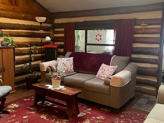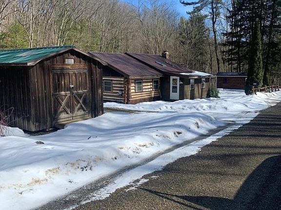 Cozy two-bedroom natural log one-floor dwelling with enclosed front porch/entry, covered rear deck overlooking a wooded ravine and hillside, partial basement with laundry area, and a serene view of the wooded hillside. Renovated kitchen and bath. Great first home or one for "empty nesters". Super for a seasonal home. Dimensions are not necessarily accurate.