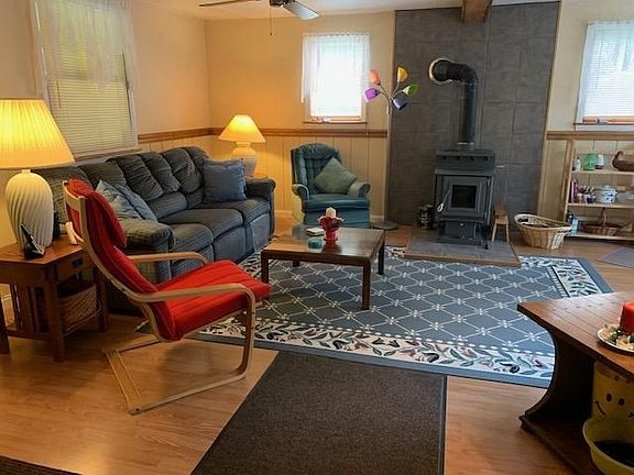 Quiet setting for weekend getaways or full time residency this 3 BR, 2 bath home offers plenty of space to enjoy the great outdoors as well as cozy in for an evening in front of the wood stove. Offers an equipped kitchen and full bath on the first floor with additional storage and upper level offer three dedicated bedrooms with a 3/4 bath attached to the master bedroom. The large rear deck gives you the opportunity to observe passing wildlife or watch the stars. The over sized, detached garage gives plenty of room to store kayaks or recreational vehicles. The +/- 10 acres is largely wooded and borders a small stream.