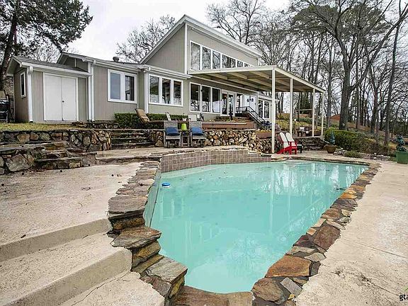 Lovely waterfront home on one of the prettiest lots on Lk. Tyler. Panoramic views w/open waterfront, located on beautiful Lk. Tyler East in restricted area of nice homes. Rich wood-look laminate floors welcome you to this great lake home; lge open windows to take full advantage of the lake views. Lots of recent updates including exterior Smart Siding (Fiber Cement Siding), roof, gutters, new piers & beams underneath, CH&A, deck, walkway to lake; kitchen w/tile floors & granite countertops & bathrooms w/tile floors, glass shower doors & granite vanity tops. 2 Split bedrooms downstairs + 1 bedroom w/bath upstairs w/wall of windows overlooking lake, would also make a great game room or playroom. So tastefully done & light throughout. An added bonus: An inviting gunite pool w/spa overlooks lake! Beautiful landscaping & retaining walls. Boathouse, 2 boat stalls + jet ski stall & decking to enjoy entertaining on the lake! Lake Tyler is great for recreation, fishing or just enjoying the peaceful lifestyle of lake living! Conveniently located to Tyler shopping.