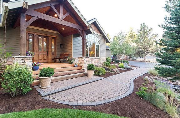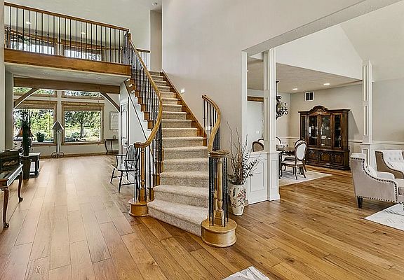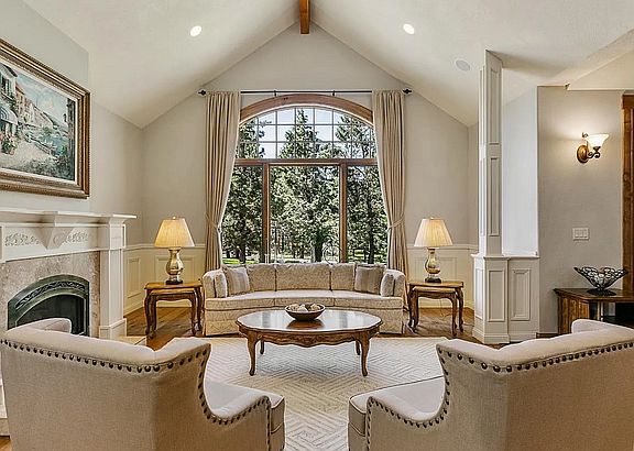 Experience where beauty and luxury meet seamlessly in this stunning private gated community. A tranquil front stream gurgles beneath the walkway leading to a serene pond, setting a peaceful tone upon arrival. The grand entry features a covered Timber Frame design with a curved wrought iron staircase and bridge, creating an impressive first impression. Inside, enjoy an 18-foot wall of windows offering breathtaking views of the Golf Course and Broken Top. The home boasts extraordinary features including a massive stone wood-burning fireplace in the family room and a propane fireplace in the living room, capable of heating the entire home. Rich Hickory wide plank hardwood floors flow throughout, complemented by knotty Alder solid-core doors and cabinetry throughout. Each bedroom has its own bathroom for ultimate privacy. The study with a kitchenette, media room, home office/library, and a large, sunny kitchen provide versatile living spaces. The master suite on the main floor features a soaking tub and private entrance for added luxury. Additional highlights include a built-in home sound system, a spacious utility room, and a triple-car garage with epoxy floors, storage cabinets, and a workbench. Step outside to the Trex deck and fire-pit area, all beautifully landscaped for outdoor enjoyment. This exceptional home truly offers the perfect blend of elegance, comfort, and natural beauty.