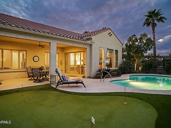 Motivated Sellers On A Beautiful Expanded Fresco Model in Desirable Pebble Creek! 2 bedrooms, 2.5 bathrooms and an oversized den with barn doors for privacy! Professionally decorated with custom window treatments in main areas and wood shutters Thru out the home. Newly installed & upgraded carpet in master bedroom & den. This home is loaded with upgrades! Beautiful appointed kitchen with upgraded white cabinetry, upgraded countertop, & walk-in pantry! 2 Car Garage Plus Golf Cart Garage! Attic insulation added in 2021! DREAM BACKYARD!! Manicured Resort Style Backyard with Inground Heated Pool, Putting Green, Covered Patio, and Lounge Area! Corner Lot Siding Professionally Landscaped Common Area for Additional Privacy!! Located in Pebble Creek Active Adult Community Full of Amenities !! and Spas, Theater, Pickle Ball Courts, Bocce Ball, Baseball, Softball, Dog Parks, Two Sprawling Clubhouses, Restaurants, and much much more! This is a home not to miss!!