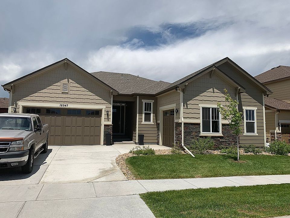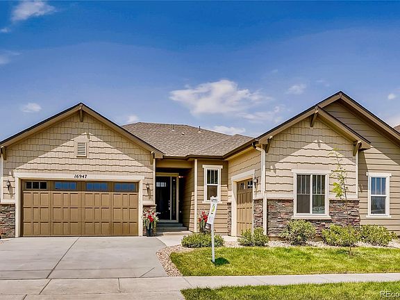 This beautiful ranch-style home, nestled in the master-planned community of Reunion, offers the beauty of stunning Colorado sunsets, abundant neighborhood amenities and quick & easy access to both Denver and DIA. Backing up to open space, this fabulous home features a first-floor master, a walk-out basement and easy-to-maintain landscaped backyard/patio. Inside, you'll love the open floor plan, beautiful hickory floors, large great room and eat-in kitchen with plenty of windows and beautiful views. The contemporary kitchen has a large center island, granite counters, a walk-in pantry, and stainless steel appliances. Sunset dinners on the deck with views of horse properties and mountains in the distance adds to the uniqueness. The elegant master bedroom offers a 5-piece ensuite bath and spacious walk-in closet. The main floor boasts two additional bedrooms, a large office, full bath and laundry room. The walk-out basement has a beautiful 2nd master bedroom, ¾ bath, separate laundry, walk-in closet AND an adjoining great room completely wired/plumbed for a wet bar or full kitchen - perfect for a mother-in-law unit or for out-of-town guests. The basement's remaining 1,400 sq ft is ready for you to customize with additional bedrooms, bathroom, work-out room or storage. The attached 3-car 22.6ft deep garage offers plenty of space for cars/full-size truck and all your outdoor equipment. Reunion offers amazing amenities such as a clubhouse/workout facility with lap pool/water park, basketball/volleyball courts, parks, playgrounds, trails and a city center with a coffee shop. Don't miss out on this opportunity to live in this amazing community!