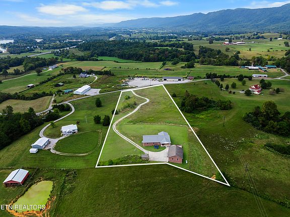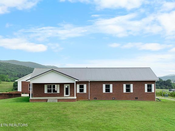 Have you always dreamed of living on acreage with privacy and phenomenal mountain views? This spacious brick rancher is a rare find. Perched atop a scenic knoll, the home welcomes you with open-concept living areas, abundant natural light from oversized windows, and elegant hardwood flooring throughout. The kitchen offers a roomy pantry and flows seamlessly into the living and dining areas—perfect for gathering and entertaining. Each bedroom has its own private bath, while the primary suite boasts exceptional space with a double vanity, walk-in shower, and a huge walk-in closet. Every detail of the home was built with size in mind, from the wide hallways to oversized utility closets and living spaces. Practical updates include a newer low-maintenance metal roof. Outside, you'll find a covered front porch that frames sweeping mountain views across most of the 5 acres. The property also features a massive 1,312 sq. ft. garage that's been partially finished and could easily be converted back to a two-car garage with a simple door change, along with a spacious poured concrete pad in the back that's perfect for additional parking. Located just minutes from ATV trails and Norris Lake, this property is ideal for those seeking a mini-farm, outdoor adventure base, or simply peace and privacy with a view. Call today to schedule your private tour!