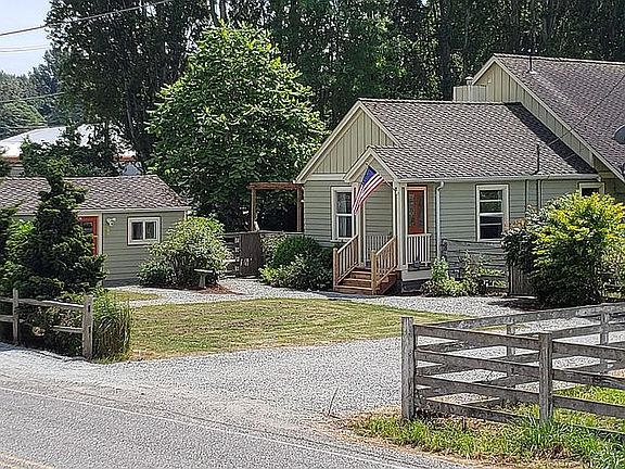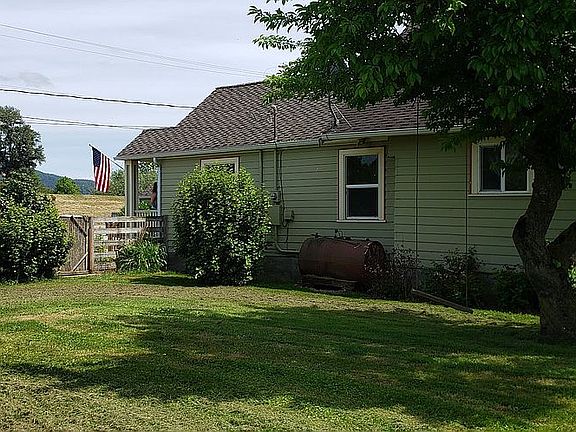 Charming 3 bedroom, 1.5 bath farmhouse with coved ceilings. Mature landscaping, deck with hot tub for entertaining, fully fenced yard has apple, plum and pear trees, a pond and waterfall, fire pit, chicken coop, and 8x10 garden shed. Open floor plan with updated kitchen, custom built cabinets, tile back-splash, concrete counter tops, eating bar and wine rack, and more! All appliances stay. This home has gorgeous sunsets and farmland views. Newly remodeled 220 square foot outbuilding with a half bathroom is a perfect space for a home office, work shop, or guest house.