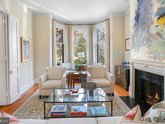 This impressive 6 bedroom, 5 and 1/2 bath semi-detached brick row house is ideally situated on a prominent street in Georgetown’s historic East Village. The Victorian-style home circa 1894, showcases stunning architectural details, including exterior dentil trim, arched brickwork, and an elegant front turret. Its highly desirable layout features a seamless flow between spacious rooms, bathed in natural light from large windows and elevated by high ceilings throughout. The graceful front vestibule opens to a welcoming entry foyer with limestone floors. The living room, which can be closed off with pocket doors, boasts intricate moldings, a beautiful bay window, and a fireplace framed by a detailed marble mantle. The adjacent dining room includes another fireplace with marble accents and the original restored Italianate crystal chandelier. At the rear of the home, the fabulous gourmet eat-in kitchen is equipped with top-tier new stainless steel appliances, a generous center island with storage, a fireplace, and a built-in desk. Two exterior doors lead to the rear terrace and garden. The second level is home to two bedroom suites, including the luxurious primary suite. The primary bedroom features a charming bay window, a walk-in closet, a fireplace, and a private office/sitting room. The elegant primary bathroom is fitted with dual vanities and a frameless glass shower. The second bedroom on this floor also has an en-suite bathroom and overlooks the rear garden. On the third floor, two additional bedrooms offer fireplaces, large closets, and share a well-appointed hall bathroom with a linen closet. The top floor offers versatile open space with plentiful storage, exceptional views and could function as a fifth bedroom. It includes an en-suite marble bathroom with a frameless glass shower. The lower level features a separate entrance and provides a spacious recreation room, ample storage, and a convenient in-law or staff suite with separate access, a kitchenette, and a full bathroom. The laundry room, located on this floor, is equipped with a utility sink, folding station, cabinetry, and a second refrigerator and freezer. Off-street parking ( with electric car charger ) for one car is available in the rear. This remarkable residence is just steps to Dumbarton Oaks Park, and a short walk to the Evermay estate and as well as distinguished shopping and cafes.