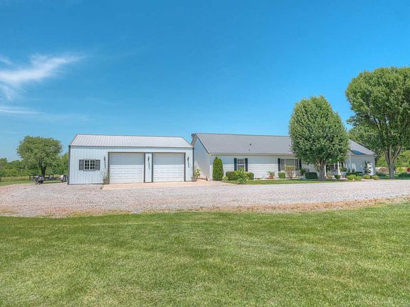 Situated on two park-like acres, just 10 minutes from Pittsburg, KS, and just outside Mindenmines, MO, this upgraded 3-bedroom, 2-bath manufactured home has many incredible features, including a large two-bay detached shop / garage. Down the long driveway and through the remote-controlled gate, you will enjoy privacy and peace away from it all. Both the front and backyard are neatly manicured and landscaped, and dotted with mature trees, including a producing apple tree. The covered front porch with composite decking welcomes you into a fantastic floorplan with two living areas, an office, and a formal dining room. The eat-in kitchen has ample storage and the perfect layout for prepping meals, with an adjoining breakfast nook overlooking the extended back patio. With a split-bedroom
