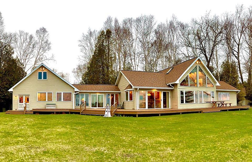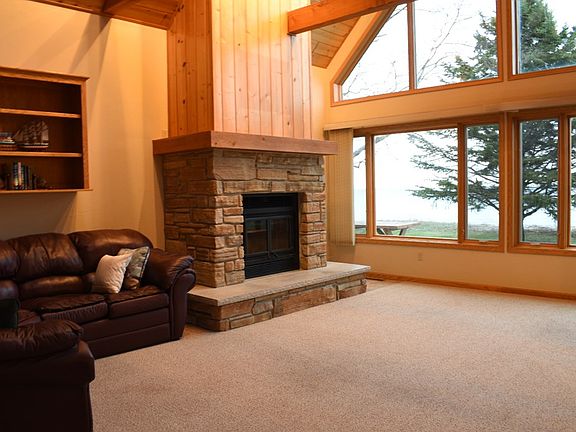 Enjoy Lakefront lifestyle in this sprawling ranch w/captivating views. Lovely floor plan w/updated windows/patio doors across back of home offering expansive deck for entertaining/quiet time/outdoor enjoyment. Functnl breezeway. Updated kitchen w/granite cntrs, flooring, applncs, plumbing fixtures. Great room wood-burning FP w/ductwork for 2nd source htg, tongue/groove vaulted ceiling & loft. Property boasts walk-in water frontage of sand/small stones, fire-pit, addl 1.5 stall gar w/ upper storage, shed, carport, 2 stl attached garage offers workshp off back access to deck, Stairs to bonus rm/bdrm/flex space. Roof 2010, Both furnaces updated past 3-5 years, So much more to offer!!