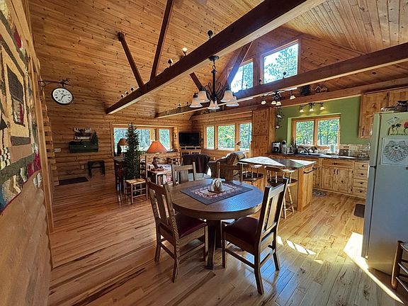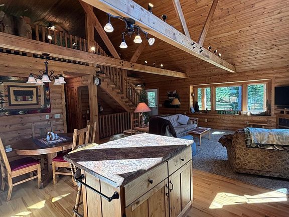 The tranquility of the Northwoods can be found at this quaint log cabin, which is tucked away on 10 acres of hardwoods and pines! The tongue and groove cathedral ceilings, knotty alder kitchen cabinets, log beams, and hickory hardwood floors are all beautifully designed. There are 2 bedrooms and a loft for extra sleeping space. Your design concepts are welcome in the full unfinished basement. From your new northern dream, you can easily access the trails. Excellent storage for outdoor toys in a 3 stall garage! Come take a look! Furnishings are negotiable for the turn-key option.