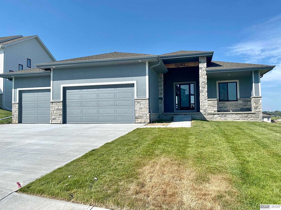 Proline Berkeley Ranch with modern elevation on a SOUTH facing WALKOUT lot in Newport Vista. Open floor plan with large windows & daylight throughout. Great room features a stone fireplace. Large kitchen with locally made custom cabinetry, quartz countertops, huge center island & walk-in pantry! Primary bath with double sink vanity, huge walk-in shower & walk-in closet. Spacious laundry room with sink vanity and upper cabinet. Drop area coming in from garage with drop zone area & coat closet. Huge three car garage. Covered deck on rear. Unfinished basement with 2 egress windows as well as rough ins for wet bar and 3/4 bath. Buyer to verify current HOA fees and schools. AMA