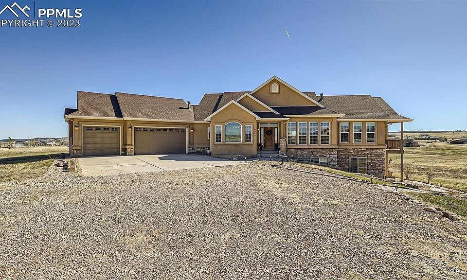 Beautiful Stone and Stucco Exterior Rancher located on 5 pristine acre lot! Large picture windows with house situated with Pikes Peak Views in mind. This home has it all - Hickory Raised-Panel Cabinetry, Oak Hardwood Flooring, High Grade Carpeting, Upgraded Light Fixtures, Ceiling Fans! The Kitchen is designed for entertaining, Granite Counters, Ceramic Tile Backsplashes, and Upgraded Appliances! The Kitchen/Nook, Master Bedroom, Dining Room, Study and Living Room all on the Main Floor. Trex Decks Off Kitchen/Nook and Off Master Bedroom. The first Fireplace is located in the Living Room area and the 2nd is in the Kitchen/nook area allowing for a Cozy atmosphere. Third Fireplace is in Lower-Level Family/Rec Room Area. Hotwater circulating System, 2 Furnaces and 2 50 gal. Hot Water Heaters And Hot Water Circulating System. Heated Floor in the Shower. Home Is Designed for Family and Entertaining Comfort In Mind. There are views from most every room in the house. The kitchen features custom cabinetry granite counters, breakfast nook, and upgraded stainless steel appliances. The spacious master suite features private access to a rear deck, luxurious 5 pc bath with dual vanities. The fully finished basement walks out to LARGE partially covered patio with rolling hills views! It also features the family/game room, a 2nd Master with large walk-in closet and on-suite, 2 additional bedrooms, a 3/4 bathroom, wet bar with sink and a mini fridge. Convenient access to Hwy 83, Flying Horse, Fox Run, Monument, and I-25. Not to mention, NEW Class 4 Hail Resistant Roof. Viewing this home will be a Pleasurable Experience!
