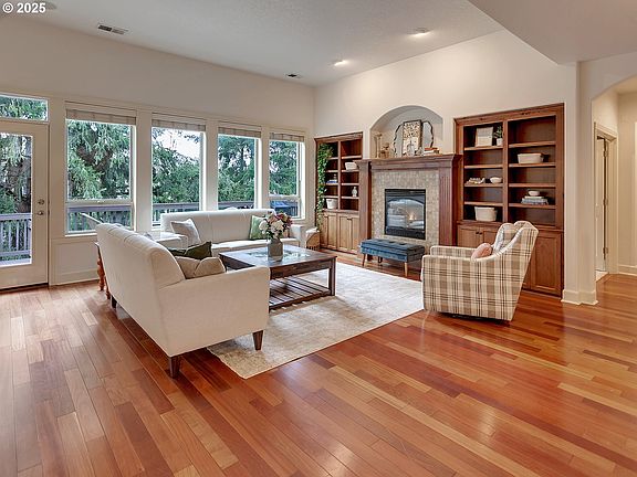 When location, layout, amenities and opportunity come together, you've found the one!Located in the desirable Richen Park community, this beautifully designed daylight basement home backs to lush greenspace and offers exceptional living just steps from Woodhaven Park, walking trails, and top-rated Sherwood schools.Timeless curb appeal welcomes you with a curved walkway, covered front porch, and manicured landscaping. Inside, rich hardwoods flow throughout the main level, complemented by tall ceilings, signature Renaissance archways, coved details, and crown molding. The spacious foyer leads to a den with built-ins, a powder bath, and a formal dining room with a butlers pantry and large walk-in pantry.The gorgeous kitchen showcases granite countertops, a tile backsplash, stainless steel appliances, a cook island, beautifully stained cabinetry, and an eating nook, all opening to the great room with custom bookcase built-ins, a gas fireplace, and large wall of windows overlooking private, tree-lined views.The main-level primary suite is a true retreat with its own wing. You'll find a spa-like soaker tub, dual vanities, tiled shower, and a generous walk-in closet. The main level also includes a large laundry room with built-ins, a sink, and mudroom area, plus a 3-car garage with high ceilings for extra storage.Downstairs, the daylight basement features a spacious bonus/media room with a second gas fireplace and built-ins, full bathroom, hobby room, abundant storage, and three additional bedroomstwo connected by a Jack-and-Jill bathroom, and another on the opposite side, situated near another full bathroom.Enjoy outdoor living on the oversized deck and oversized natural-edge patio in the peaceful fenced backyard. A rare offering in a prime Sherwood location! Some recent improvements by the home seller:-New water heater Oct. 2024-Exterior painting March 2025-Interior painting March 2025-New carpet March 2025 -Landscaping March 2025