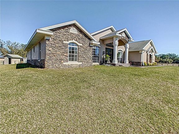 Get ready to be dazzled. This stunning four bed three bath home on 5 fully fenced acres is set back from the road for optimal privacy. This spacious home features an office perfect for working at home, a dining room, a screened in back porch, and a gas fireplace to get cozy near. The master bathroom features a soaking tub, a shower and a walk in closet. This spacious custom home features a true split floor plan, plantation shutters and a two sided fire place in the living room and the office. This property is zoned A-1 and is ready for your horses. A shed row barn with three 12X12 stalls and two areas for tack and feed is on the property. Convenient to the barn is a new concrete wash rack. The barn is built on skids however, it could easily be made permanent. The property perimeter is fully fenced and two large pastures are fenced within the property. The location provides the best of spacious country living with the convenience of a short drive to Ocala, shopping centers, and restaurants. The home is located 17 minutes from the World Equestrian Center. Do not hesitate to schedule a tour of this property. Virtual showings are available.