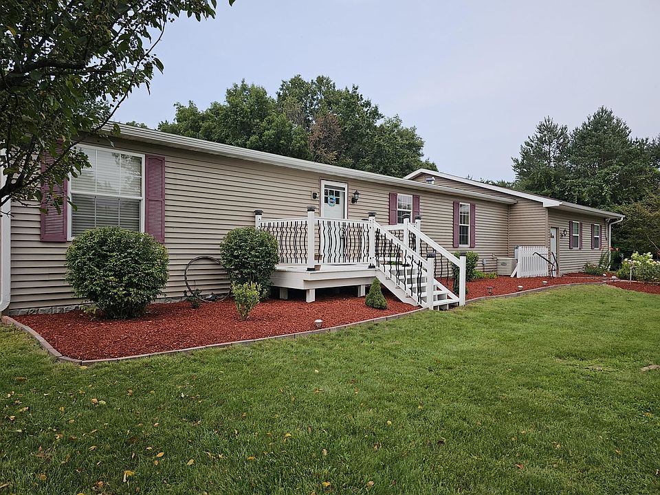 4 bedroom 2 bath on an 8 acre, beautiful wooded lot. This is a 2002 doublewide with attached 3 car garage. The 50x30 pole bldg has electric and 14' rolling door, also 2 more sheds measuring 24x12 and 16x12. Nicely landscaped yard. The 12x9 4th bedroom could be a 2nd walk-in closet for the master bedroom suite that has a 4x7 walk-in and 4 piece bath with garden tub. Open concept kitchen, dining and living area with door opening to the back deck and yard. Front and back decks have metal spindles, there is a fenced in garden area and acres of woods to explore. Main floor laundry is 9x8. Home has central air, natural gas and city water. Appliances included. Home is in very good condition.
