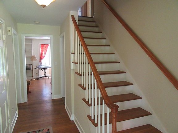 Center hall Cape offers updated kitchen and baths, first floor bedroom and bath, or can function as in-law suite. Large living room with fireplace and built-ins. French doors open to huge deck that wraps around rear of house. 3 bedrooms upstairs, master bedroom with sitting room and skylight. Walk out basement opens to huge rear yard. Property abuts town land, so yard appears even larger and more spacious.Home has great privacy and huge amounts of storage, including a root cellar. Central air, newer windows.