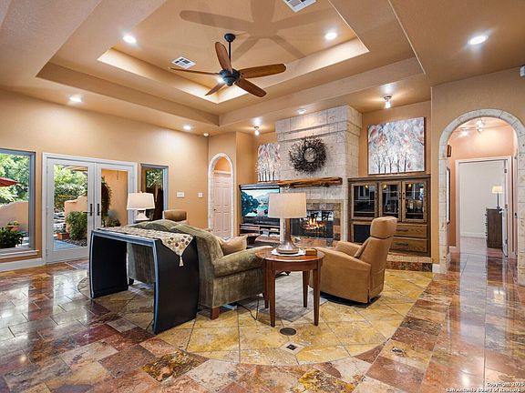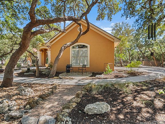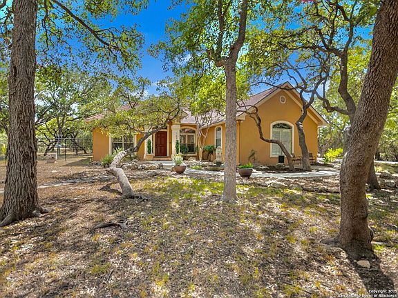 Welcome home to your tranquil escape in the heart of the Texas Hill Country. This impeccably clean and well-maintained property offers the perfect blend of functionality, charm, and serenity - all within the boundaries of a friendly community featuring private Guadalupe River access through the HOA park. Step inside and be greeted by an abundance of natural light that highlights the spacious layout and elegant stone flooring throughout the main living areas. Set up for either three bedrooms and an office or take advantage of the potential for a double office setup, this home easily accommodates both family life and work-from-home needs. At the heart of the home lies the stunning chef-inspired kitchen, designed for both everyday living and entertaining. Enjoy a large island that provides ample workspace and storage, perfect for preparing gourmet meals or gathering with guests. The breakfast area features huge windows that flood the space with light and offer sweeping views of the outdoors, truly bringing the outside in. Enjoy Texas evenings around your custom outdoor fireplace or gather with friends around the fire pit under the stars. The expansive outdoor living spaces are made for entertaining and peaceful relaxation. The fully fenced 2-acre lot is ideal for animals, and includes raised garden beds, a garden shed, and a workshop - everything you need for a self-sustaining lifestyle. Located within the prestigious Smithson Valley High School district, this home combines country comfort with convenient access to top-rated schools and amenities. Whether you're dreaming of a peaceful retreat, a hobby farm, or a place to simply enjoy wide-open spaces and nature, this home offers it all and more.