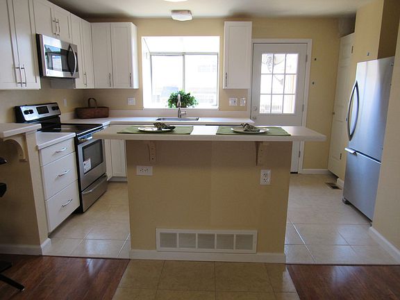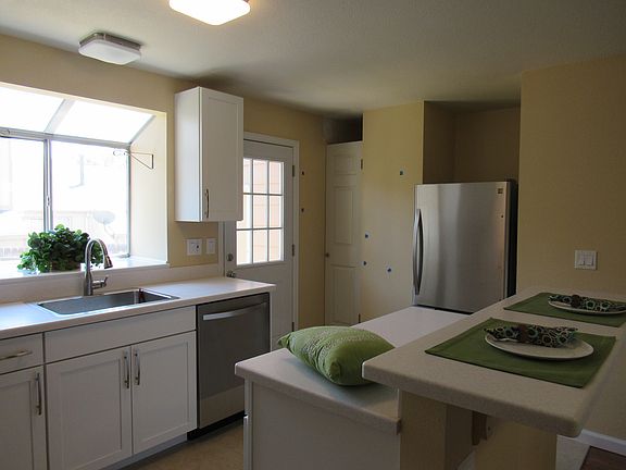 2 story townhouse - NEW Central air and furnace, NEW KITCHEN with island, new stainless appliances, premium modern white cabinets with modern brushed nickel pulls, with solid surface counter tops - tile floor, remodeled baths (tile floors, new water efficient toilets, new vanity, new sinks, lighting, hardware) , laminate floor in living rm, tile floor in both baths. Updated master bedroom with 2 large clothes closets with louvered doors, vaulted ceilings in both bedrooms. New carpet and paint. Wood burning fireplace in living room.