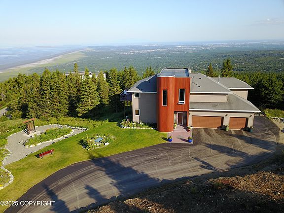 Set on five peaceful acres with a front-row seat to breathtaking views. Vaulted ceilings and floor-to-ceiling windows bring the outside in. An open dining area flows into the living room and cook's kitchen great for entertaining. Spacious primary suite offers quiet retreat with office/library, bath and generous wardrobe. Downstairs with family room, 2 bdrms + bath. Epic decks and 3 car garage.Perched high on the Anchorage hillside, this beautiful home offers a front-row seat to one of the most breathtaking views in the state - an uninterrupted panorama of the Alaska Range, the shimmering waters of Cook Inlet, the twinkling lights of the Anchorage cityscape and the distant majesty of Mount McKinley - taking in the full grandeur of Alaska in one singular, breathtaking frame. The well-established flower beds add bursts of color and charm in all the right places. Thoughtfully designed and lovingly maintained, these gardens are tucked into the landscape with intention, framing entryways, softening architectural lines, and enhancing outdoor living spaces. Perennials, seasonal blooms, and native plants combine to create a tailored, harmonious look that feels both cultivated and natural, co-existing beautifully with the wooded surroundings. The home's design moves seamlessly from the grandeur of the outdoors to the elegance within, beginning with an expansive multi-level Trex deck that is so much more than a place to take in the view, it's an outdoor living space designed for enjoyment and relaxation. There's ample room for multiple seating areas, and vibrant flowerpots that add seasonal color. Whether hosting a summer gathering or enjoying a New Years fireworks, it's a perfect spot with breathtaking surroundings. The home's vaulted ceilings and floor-to-ceiling windows bring the outside in, filling the space with natural light and showcasing the ever-changing views. An open dining area, surrounded by glass, flows easily into the living room and cook's kitchen, complete with high-end appliances and a granite island ideal for entertaining. Expansive wall space and soaring ceilings add a sense of drama and openness, creating an ideal canvas for art lovers to display cherished collections. Every detail throughout reflects a thoughtful balance of form and purpose. The spacious primary suite offers a quiet retreat with its own office/library, spacious bath with heated floors, and generous wardrobe areas. Downstairs, the family room, two additional bedrooms, and a jacuzzi tub provide flexible space for guests or multi-generational living. Additional features include hardwood floors, a wine closet, three-car garage, surround-sound wiring, remote window blinds, and a top-tier, smartphone-enabled security system. Every element of this home is designed for sophisticated, yet comfortable living to complement the grandeur just beyond its windows, blending functionality, and peace of mind.