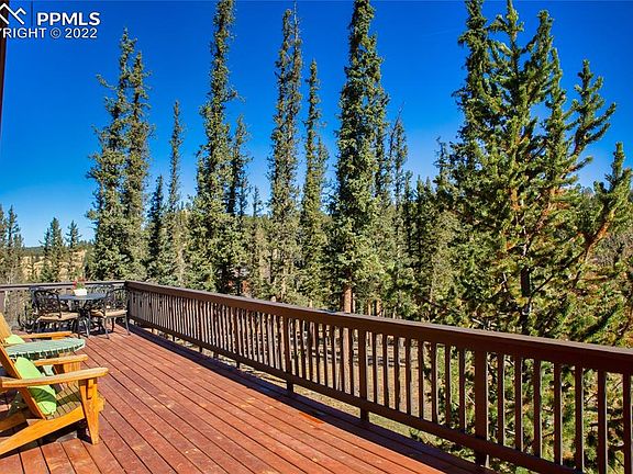 One owner custom built home on sprawling wooded lot. This home shows pride of ownership inside and out. Pikes Peak view! Low maintenance Hardi board siding. Double sided wood burning stone fireplace to enjoy from all angles of the main living space! Plenty of windows & a skylight provide natural lighting Inviting wrap around deck that's wide enough to have a picnic table on. Stereo with speakers throughout the house! Huge heated garage with a wet sink. 4 Stocked Fishing lakes to enjoy year round! Club house & picnic area! Family room opens up to a private patio. Hot water radiant heat. Propane tank is owned not rented. If you have a buyer who wants a quality built home and property this is it! Extra paved parking area. Owners say that hard wired smoke alarms are also CO2 detectors. Alarms are hidden in lower level in ceiling panels.